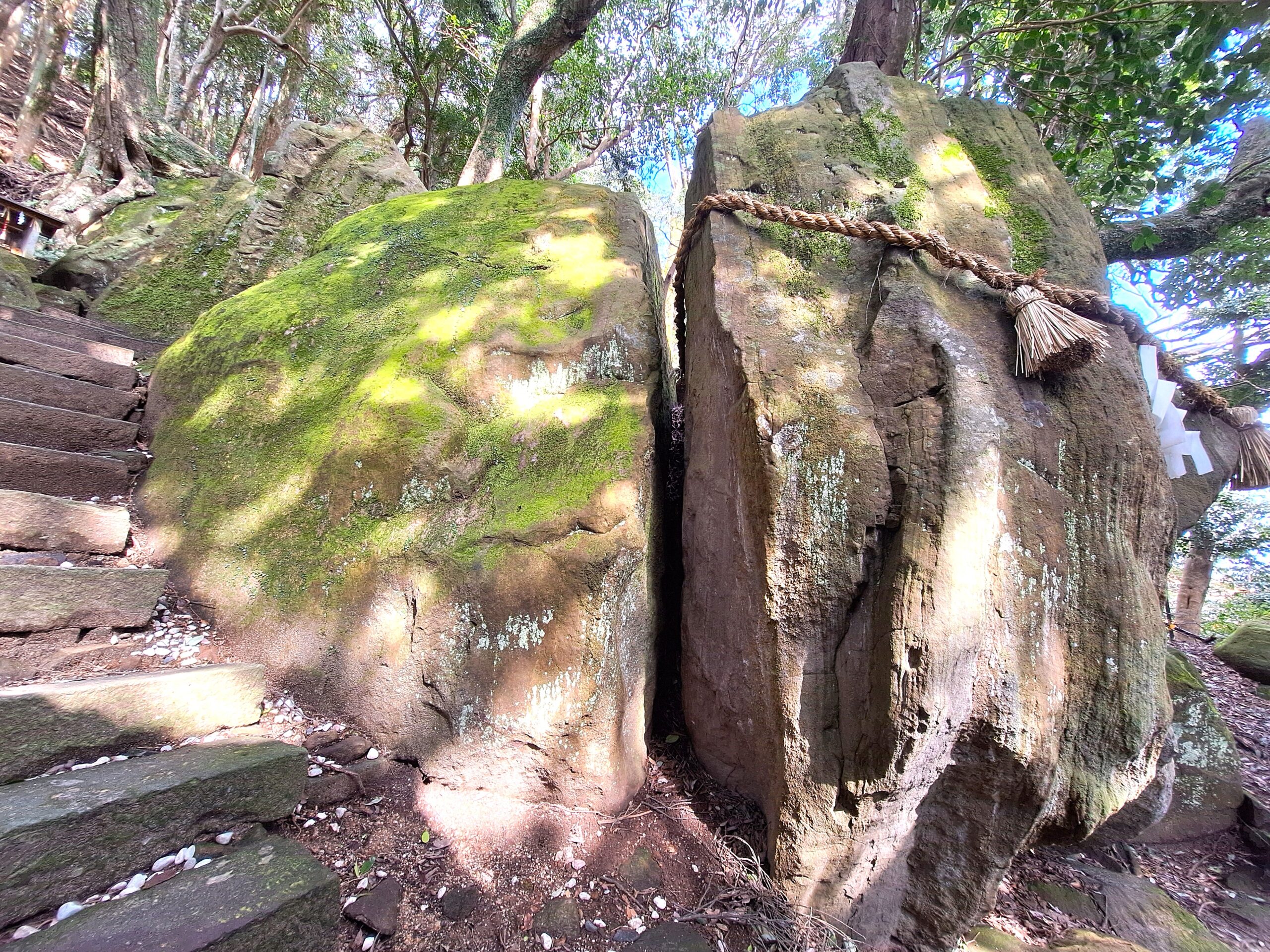 もとは1つであった岩が割れたものなのか、2つの岩が合わさってこのような形状をしているのかは明らかでないそうですが、北を向いた割れ目の先には北極星があることから、社殿が創建されるより以前の自然崇拝、巨岩信仰の名残りであると考えられているそうです。